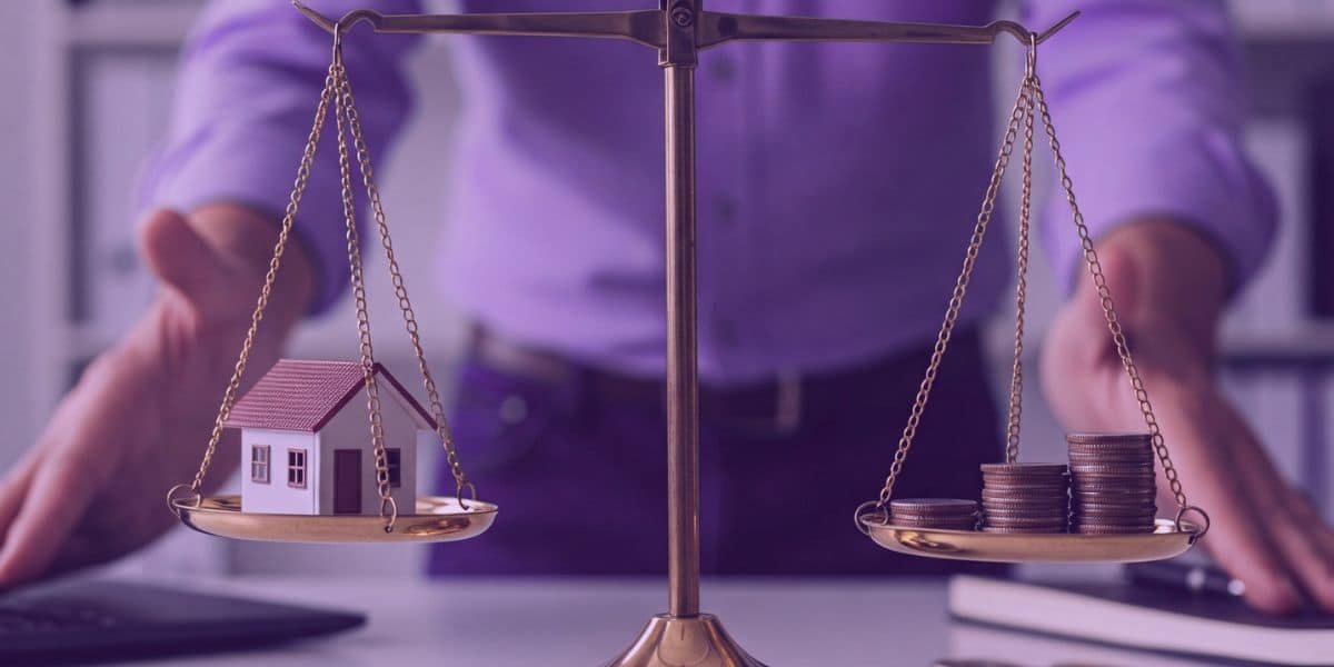 Herança Jacente e Vacante: Uma balança da justiça com uma casa e uma pilha de dinheiro em equilíbrio.