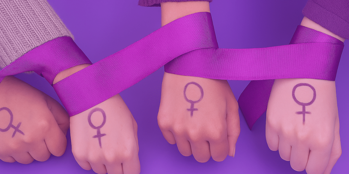 Lei Maria da Penha: mãos para o alto segurando flores na cor lilás.